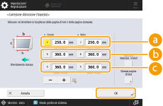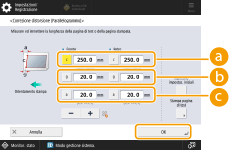 2 | Misurare e inserire i valori delle seguenti voci  premere <OK>. Utilizzando i seguenti tre valori numerici, un dispositivo si regola automaticamente in modo che l'area di stampa e la carta possano sistemarsi in parallelo. <c>Inserire la lunghezza misurata del margine superiore dell'area di stampa, nel senso del caricamento. <g>Immettere la lunghezza misurata dal bordo di testa sinistro dell'area di stampa al bordo di testa della carta consegnata. <a> Immettere la lunghezza misurata dal bordo di testa destro dell'area di stampa al bordo di testa della carta consegnata. Seguendo l'esempio, inserire 250,0 per <c>, 20,5 per <g> e 21,0 per <a>. La differenza tra <g> e <a> (0,5 mm) viene corretta automaticamente. |