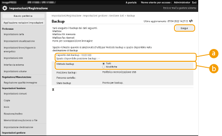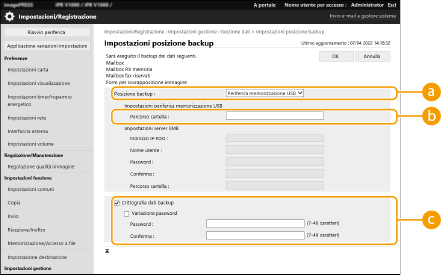 Non modificare né eliminare i dati di backup. Tale operazione potrebbe impedire il ripristino corretto dei medesimi. Non eseguire il backup mentre la macchina viene operata attraverso il pannello comandi o la IU remota. |