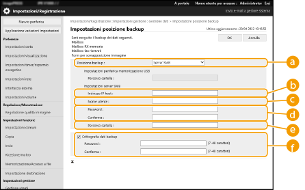 Una volta effettuato il backup, è possibile fare clic su [Registro backup/ripristino] sulla schermata visualizzata alla fase 6 e verificare i risultati del backup in [Risultato]. Se viene visualizzato il messaggio [Errore server.], non è possibile configurare correttamente le impostazioni di rete. Verificare le impostazioni di rete. I dati di backup possono essere ripristinati non solo nella macchina ma anche negli aggiornamenti dello stesso modello. |