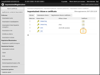 Il codice che ha generato la richiesta CSR viene visualizzato nella schermata elenco codice e certificato, ma non è possibile utilizzarlo autonomamente. Per utilizzare questo codice è necessario registrare il certificato che viene rilasciato successivamente e che è basato sulla richiesta CSR. Registrazione di un certificato su una chiave |