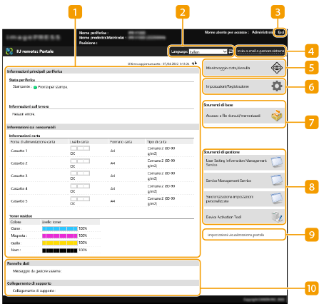 Alcune voci e funzioni visualizzate sono disponibili esclusivamente se si effettua l'accesso con privilegi di Amministratore. Se più utenti utilizzano la IU remota contemporaneamente o il pannello di controllo della macchina è utilizzato contemporaneamente alla IU remota, è valida l'ultima operazione eseguita. |
