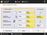 2 | Selezionare le impostazioni di copia in <Risguardo anteriore> e <Risguardo posteriore> premere <OK>.Se non si desidera copiare sul risguardo, premere <Lascia in bianco>. Se si alimenta carta per il risguardo da "Document Insertion Unit-R", selezionare <Lascia in bianco>. Per impostare la carta per il risguardo, premere <Cambia> per <Selezione carta> selezionare la fonte di alimentazione della carta premere <OK>. |