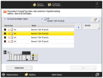 Sie können Papier im benutzerdefinierten Format einlegen, wenn beide Seiten des Papiers zwischen 182 mm und 487,7 mm lang und zwischen 182 mm und 330,2 mm breit sind. Sie können kein Papier im benutzerdefinierten Format einlegen, wenn eine der Seiten kleiner oder größer als die Papierformate ist, die eingelegt werden können. Wenn die Aufforderung zum Einlegen von Papier während des Druckvorgangs angezeigt wird, werden die restlichen Drucke automatisch erstellt, nachdem Sie das richtige Papier eingelegt haben. Wenn Sie eine andere Papierzufuhr wählen, werden die restlichen Drucke ausgeführt, nachdem Sie die Taste <OK> berührt haben. Wenn Sie den Druckvorgang abbrechen möchten, berühren Sie die Taste <Abbrechen>. Wenn Sie den Papiertyp zum Einlegen in das Papiermagazin von Normalpapier zu beschichtetem Papier verändern, müssen Sie möglicherweise einen Moment warten, weil die Temperatur der warmen Luft, die den Papierstapel auffächert, erst geregelt werden muss. |