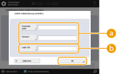 <Anwendername>/<Passwort>Geben Sie den Benutzernamen und das Passwort eines Administrators mit Administratorrechten ein. Stellen Sie sicher, dass dieser Administrator als ein Benutzer im Clientgerät und auf dem Authentifizierungsserver, der vom Clientgerät verwendet wird, registriert ist.