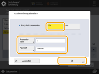 <Authentisierung einstellen>Drücken Sie diese Schaltfläche, und konfigurieren Sie die Authentifizierungsinformationen, um die Authentifizierungsfunktion des Proxyservers zu verwenden. Drücken Sie im eingeblendeten Fenster auf <Ein>, geben Sie den Benutzernamen und das für die Proxyauthentifizierung zu verwendende Passwort ein, und drücken Sie <OK>.