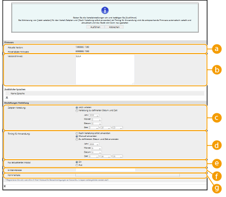 [Zeitplan Verteilung]Um die Firmware sofort herunterzuladen, wählen Sie [Jetzt verteilen]. Um die Firmware an einem bestimmten Datum zu einer bestimmten Uhrzeit automatisch herunterzuladen, wählen Sie [Zum angegebenen Datum und Uhrzeit verteilen], und legen Sie das Datum und die Uhrzeit in [Jahr]/[Monat]/[Datum]/[Zeit] fest. Sie können die Zeit eine Woche im Voraus planen.
