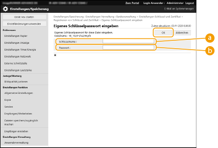 2 | Geben Sie den Schlüsselnamen und das Passwort ein, und klicken Sie auf [OK]. [Schlüsselname]Verwenden Sie alphanumerische Zeichen, um den Namen des Schlüssels einzugeben, der im Gerät registriert wurde. [Passwort]Verwenden Sie alphanumerische Zeichen, um das Passwort des privaten Schlüssels einzugeben, der für die zu registrierende Datei eingerichtet wurde. |