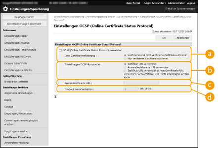 Es gibt zwei Methoden, um zu überprüfen, ob die von der anderen Partei in der Kommunikation erhaltenen Zertifikate gültig sind: Vergleich mit der im Gerät registrierten Zertifikatsperrliste (CRL) und Abfrage eines OCSP-Responder (Online Certificate Status Protocol) (ein Server, der OCSP unterstützt). Legen Sie die Methode zur Überprüfung des Ablaufs von Zertifikaten entsprechend Ihrer Umgebung fest. Diese Registrierung kann nur vom Administrator vorgenommen werden.