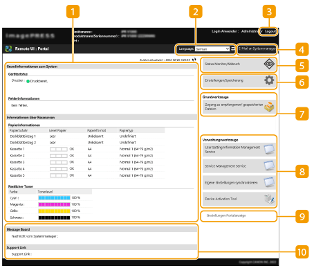 Einige Anzeigeelemente und Funktionen sind nur verfügbar, wenn Sie sich mit Administratorrechten anmelden. Wenn mehrere Benutzer gleichzeitig mit dem Remote UI arbeiten oder das Bedienfeld der Maschine gleichzeitig mit dem Remote UI bedient wird, ist der zuletzt ausgeführte Vorgang wirksam. |