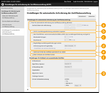 Sobald eine automatische Anforderung zur Ausstellung eines Zertifikats ergangen ist, wird der Zeitpunkt der nächsten Anforderung in [Uhrzeit/Datum der nächsten Anforderung:] angezeigt.