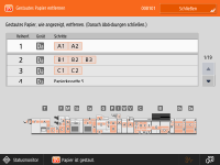 Möglicherweise befindet sich in der Position, die Sie prüfen, kein Papier. Befolgen Sie auch in diesem Fall die Anweisungen auf dem Bildschirm, um alle Positionen zu überprüfen. Der Bildschirm mit der Papierstaumeldung wird wiederholt angezeigt, bis Sie den Papierstau beseitigt haben. Wenn Sie <Schließen> auf dem Bildschirm mit der Papierstaumeldung drücken, können Sie möglicherweise mit den Vorgängen fortfahren und die Einstellungen festlegen, ohne den Papierstau sofort entfernen zu müssen. Entfernen Sie kein Papier an einer anderen Position, als der am Bildschirm als Papierstauposition angezeigten. Das kann einen Papierstau an anderen Positionen oder das Fehlen von Seiten in den Ausgabedokumenten verursachen. |