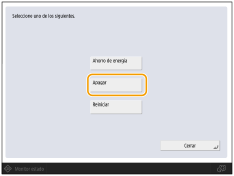 Si se muestra el mensaje <Copia de seguridad de los datos de la IU remota...> en la pantalla táctil, no apague la alimentación principal. Esto podría hacer que el equipo fallase en hacer una copia de seguridad de los datos guardados. El equipo puede tardar algún tiempo en apagarse completamente. No desenchufe el cable de alimentación hasta que el indicador de alimentación principal no se haya apagado. Si la alimentación principal se apaga durante la impresión, pueden producirse atascos de papel. El equipo puede seguir funcionando durante o después del proceso de apagado. No desenchufe el cable de alimentación hasta que se detenga el sonido del dispositivo. Cuando se completa el proceso de apagado, el interruptor de alimentación principal del equipo cambia al lado " O " automáticamente. También puede forzar el apagado del equipo (omitiendo el proceso de cancelación del trabajo normal) pulsando <Apagado forzado>. Sin embargo, si pulsa <Apagado forzado> la operación de apagado se detendrá antes de completarse, lo que podría causar daños a piezas del equipo, o la destrucción de datos que están siendo procesados, por lo que no se recomienda. Observe que Canon no será responsable de los daños resultantes de la pérdida de datos en la unidad de disco duro. Para más información póngase en contacto con su distribuidor Canon autorizado. |