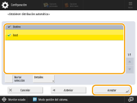 Distribución y actualización de la información del dispositivoLa información del dispositivo podría no distribuirse ni actualizarse si el equipo cliente está procesando otros datos. Si un equipo cliente no puede recibir la información del dispositivo distribuida automáticamente a la hora especificada, no se volverá a realizar la distribución hasta la siguiente hora especificada. Recibir información de dispositivo de distintos modelos de impresora multifunción CanonCuando el equipo se utiliza como un equipo cliente, puede recibir información de dispositivo de distintos modelos de impresora multifunción Canon si la opción <Restringir recepc. info. dispositivos> de <Opciones de recepción> se configura en <No>. No obstante, tenga en cuenta que es posible que parte de la información no se distribuya correctamente. Seleccione las funciones sobre las que quiere recibir información del dispositivoCuando el equipo se utiliza como equipo cliente, puede restringir las funciones sobre las que hay que recibir información configurando <Restringir recepc. para cada función> de <Opciones de recepción> en <No>. Restaurar la información del dispositivo anteriorPuede realizar operaciones en el equipo cliente para restaurar la información del dispositivo existente antes de llevar a cabo la actualización. Sin embargo, solo puede restaurar la información que existía inmediatamente antes de la actualización. La información más antigua no se puede restaurar.<Opciones distribución información dispositivo> |