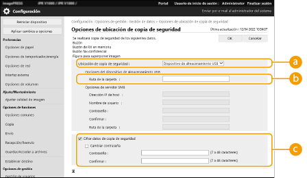 No modifique ni elimine los datos de los que se ha hecho una copia de seguridad, ya que podría impedir la correcta restauración de los mismos. No realice una copia de seguridad mientras el equipo está siendo manejado desde el panel de control o la IU remota. |