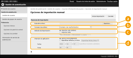 [Método de importación:]Seleccione si desea importar solo los datos de usuario actualizados o incorporados o todos los datos de usuario.