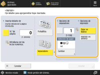 Especifique la página para insertar el papel separador, configure el número de hojas y seleccione si desea imprimir en el papel separador. Si desea imprimir en el papel separador, incluya el original que se va a imprimir en el separador en el documento original.