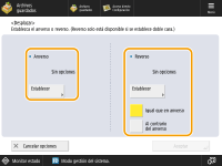 Si desea mover la imagen en el reverso al imprimir ambas caras, <Reverso> es necesario configurarlo. Para mover a la misma posición que en el anverso, pulse <Igual que en anverso>. Para mover simétricamente, pulse <Al contrario del anverso>. Para mover a una posición distinta de la del anverso, pulse <Establecer> e introduzca la distancia de movimiento.