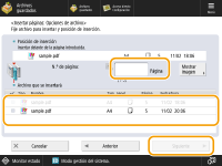 Muestra si hay archivos seleccionados, iconos que indican el tipo de archivo, nombres, tamaños de lectura, número de páginas y fechas/horas de almacenamiento.