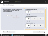 Este modo puede afectar a la alimentación del papel. Como aumentar en un alto grado el valor puede provocar atascos de papel, se recomienda ajustar los valores en incrementos pequeños. En función de las características del tipo de papel, p. ej., del papel grueso, es posible que no pueda corregir adecuadamente el doblado del papel aunque ajuste el nivel de corrección del doblado. Si las esquinas se doblan durante la impresión a 2 caras, ajuste la cantidad de corrección para <Impresión a doble cara>. |