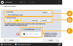<Horario de verano>Para configurar el horario de verano, pulse <Sí> y ajuste la fecha/hora de <Fecha inicio> y <Fecha fin>. Para configurar la fecha, indique el día de la semana y la semana del mes.