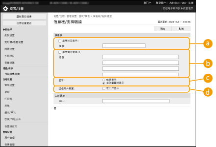 ![]() | 可以在触摸面板显示屏幕上向用户显示信息。信息可以显示在触摸面板显示屏幕的底部,也可以显示在单独的弹出式窗口中,并且可以根据信息或用户的类型选择要使用的显示方法。在弹出式窗口中显示信息时,还可以显示与“远程用户界面”门户页面上相同的信息。配置这些设置需要“管理员”权限。 |
