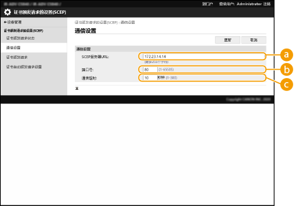 [通信超时:]输入与 SCEP 服务器通信的超时时间。如果在设定时间内没有来自 SCEP 服务器的响应,则取消连接。