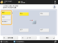 要在纸张对折的部分进行装订,选择<鞍式装订>。根据可选配件,可以添加封面或更改折叠位置。裁去输出页的边缘时,可以调整裁边位置。
