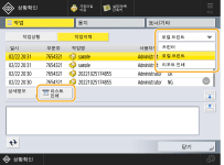 (상황확인/중지)를 누르면 상태 모니터 화면이 표시됩니다. 이 화면에서 복사, 인쇄, 이메일 전송, I-팩스 송신/수신 등과 같은 각 기능에 대한 사용 기록을 확인할 수 있습니다. 또한 이 화면에서 각 기능에 대한 사용 기록을 인쇄할 수 있습니다.![]() |
