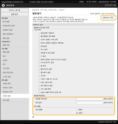 기기에서 설정 데이터 전체를 내보내어 이를 컴퓨터에 저장할 수 있으며, 교체 기기를 구입하는 경우 처럼, 새 기기에 설정 구성 시 이 데이터를 불러오기할 수 있습니다. 두 대 이상의 Canon 다기능 프린터*에 동일한 설정을 구성하려면, 전체 설정을 한 기기에서 내보내기 한 후에 다른 기기로 모두 가져오기하여, 각각의 기기를 별도로 설정하지 않아도 됩니다. 이 작업을 실행하려면, 관리자 권한으로 리모트 UI에 로그인하십시오.