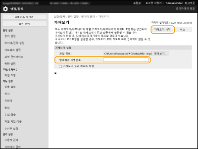 내보내기 한 설정 데이터를 가져오기할 때 [암호화 비밀번호]에 입력한 비밀번호를 입력해야 합니다. 영숫자 문자를 사용하십시오.