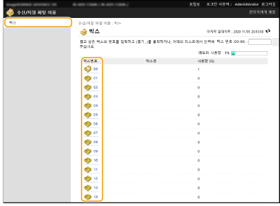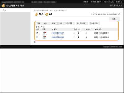 ![]() | 리모트 UI를 사용하여 메일함에 저장된 파일을 인쇄하거나 삭제할 수 있습니다. |