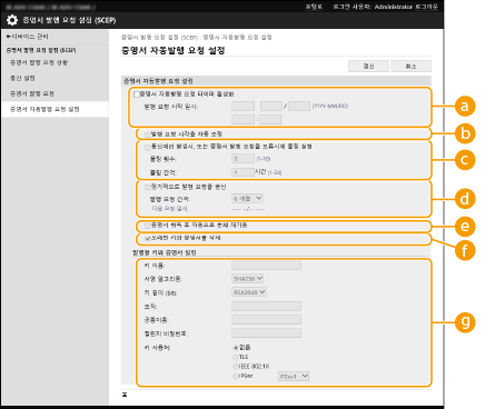 [정기적으로 발행 요청을 송신]발행할 인증서의 자동 요청을 주기적으로 보내려면 선택하고 [발행 요청 간격:]에서 주기를 지정합니다.