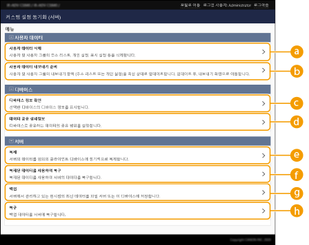 동기화할 공유 데이터 범위를 설정하고 동기화할 기기를 관리할 수 있습니다. 또한 사용자 데이터를 삭제하고 동기화 데이터를 백업/복구할 수 있습니다. 이 설정은 서버 기기 또는 서버/클라이언트 기기에만 해당됩니다.