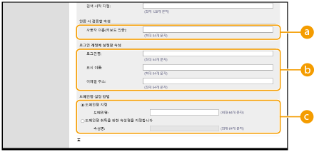 4 | 속성 이름과 도메인 이름의 설정 방법을 지정합니다. ![]() [사용자 이름(키보드 인증):]LDAP 서버의 사용자 이름에 대한 LDAP 데이터 필드(속성 이름)를 지정합니다(예: uid). [로그인명:] / [표시 이름] / [이메일 주소]LDAP 서버에 있는 각 사용자 계정의 로그인 이름, 표시 이름, 이메일 주소에 대한 LDAP 데이터 필드(속성 이름)를 지정합니다(예: uid, cn, mail). [도메인명 지정] / [도메인명 취득을 위한 속성명을 지정합니다]로그인 수신인의 도메인 이름 설정 방법을 선택합니다. 도메인 이름을 직접 지정하려면 [도메인명 지정]을 선택하고 도메인 이름을 입력합니다. LDAP 서버의 도메인 이름을 획득할 LDAP 데이터 필드(속성 이름)를 지정하려면 [도메인명 취득을 위한 속성명을 지정합니다]을 선택하고 속성 이름을 입력합니다(예: dc). |