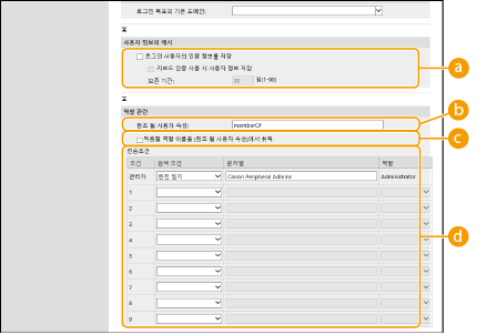 [문자열] | [참조 될 사용자 속성:]에 지정된 속성에 등록된 문자열을 입력합니다. 사용자가 속한 그룹을 토대로 권한을 설정하려면, 그룹 이름을 입력합니다. |
