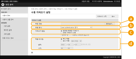 전체 가져오기를 수행할 때 가져온 파일에 열거되지 않은 사용자는 기기에서 삭제됩니다. 하지만 기본적으로 등록되어 있는 "-----"와(과) "Administrator"은(는) 가져온 파일에 열거되어 있지 않더라도 유지됩니다.