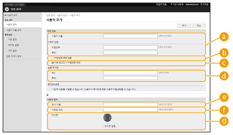 [비밀번호 만료 없음]등록할 사용자의 비밀번호에 만료 날짜가 없도록 설정하려면 확인란을 선택합니다. imagePRESS Server에서 비밀번호 만료 기간을 설정했으면, 리모트 UI에서 비밀번호 만료 기간을 무기한으로 설정할 수 없습니다. 자세한 내용은 imagePRESS Server의 설명서를 참조하십시오.