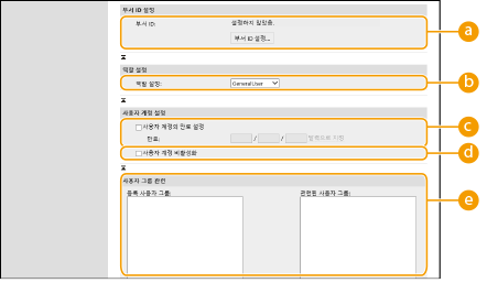 [부서 ID:]부서 ID 관리를 사용하는 경우 [부서 ID 설정...]을 클릭하고 사용자에게 할당할 부서 ID를 목록에서 선택합니다. 먼저, 목록 화면의 [새 부서 등록...]에 필요한 부서 ID를 등록합니다. 여기서 지정한 부서 ID가 나중에 삭제될 경우, 이 설정을 변경해야 합니다.