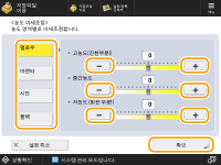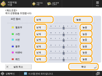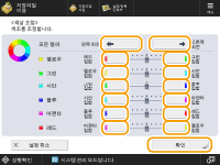 버튼을 사용합니다. 각 색상을 개별적으로 설정하려면 각 색상의 왼쪽 및 오른쪽에 있는 버튼을 사용합니다. 조정이 완료되면 <확인>을 누릅니다.