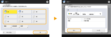 コピー/スキャンして送信では、登録した設定を呼び出すときに、確認画面を表示させないようにすることもできます。