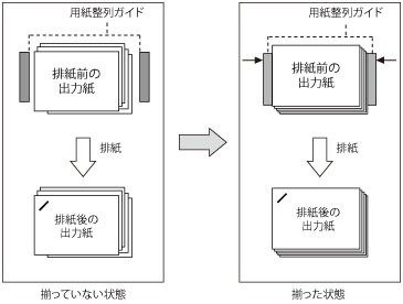 温度・湿度の影響や用紙の特性により、コピー/プリントした用紙が縮小することがあります。その場合、本機能でフィニッシャー内部の用紙整列ガイドの位置を調整し、用紙が揃わずにホチキスされるのを防ぐことができます。