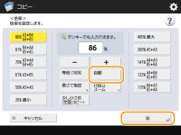 <XY独立自動>を設定した場合は、<用紙選択>で用紙を設定します。用紙を設定しないと、最上段の用紙カセットにセットされている用紙のサイズにあわせて自動的に倍率が設定されます。