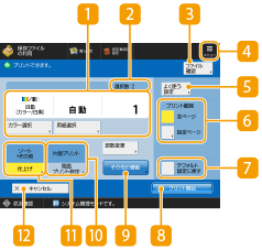 ホームの<保存ファイルの利用>を押したあと、<ボックス>、<アドバンスドボックス>、<ネットワーク>、<メモリーメディア>のいずれかを押してファイルをプリントしようとすると、次の設定画面が表示されます。
