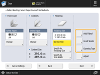 3 | Specify the detailed settings for the sheet insertions press <OK>.To select the paper for the sheet insertions, press <Change> for <Select Paper> select the paper source press <OK>.![]() If you set a different paper size for the front flyleaf, back flyleaf, or insert sheets, the paper sizes for the other features are automatically changed to the new paper size. However, changing the paper source for a feature to a source with the same paper size does not change the settings for the other features. Before feeding paper from the "Document Insertion Unit-R," load paper into the "Document Insertion Unit-R" and specify the paper size. ![]() You can insert a total of up to 100 sheet insertions. |