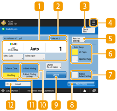 | <Print Sample> appears only if you set to make multiple prints and one of the following settings at the same time. Note that the available functions may differ depending on your model and the installed options. <Collate (Page Order)> <Offset> <Staple + Collate> <Booklet> <Front Cover> <Insert Sheets> <Merge Files and Print> when multiple files are selected |