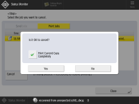 Screens that lead to <Send Jobs>/<Print Jobs> <Home> screen Top screens of <Status Monitor> (<Job>, <Paper>, <Toner/Other>) <Visual Message Settings> screen If you press (Stop) on the control panel while a send job is being processed and the <Scan and Send> screen is being displayed, a pop-up screen that directly cancels the ongoing job appears. When multiple jobs are in process, you can set which job to cancel: the job that was last made, or the job that is in the process of sending. (<Job to Cancel When Stop is Pressed>)If there is a job that was started after pressing (Stop) on the control panel, the job is performed.For instructions on canceling jobs from the <Copy> screen, see Cancelling Copying. |