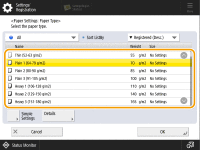 Paper Type Management SettingsWhile you are registering the custom paper type for a paper source, the paper type settings are protected and you cannot change the detailed information for custom paper type or delete the custom paper type in <Paper Type Management Settings> in <Preferences> (Settings/Registration).