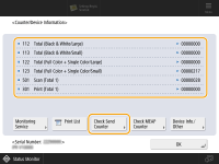 On this screen, you can also check the counter information for each MEAP application. Press <Check MEAP Counter> on the screen in step 2. If you press <Device Info./Other> <Check Device Configuration> on the same screen, you can check the options installed in the machine and the version of the security chip for storage device data encryption.