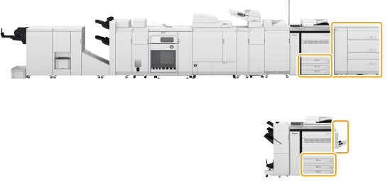 The locations of the paper drawers and each option unit for paper feeding are indicated in the following illustration.