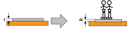 Rigidité du sol | Préparez une plaque de sol et placez-la à l'endroit où la machine doit être installée. Mesurez l'enfoncement dans le sol lorsque deux adultes (environ 150 kg) montent sur la plaque. À partir de ces mesures, estimez l'enfoncement dans le sol lorsque la machine sera installée en effectuant un calcul proportionnel. Méthode de calculChaque paramètre est spécifié comme suit : t : la hauteur depuis le sol jusqu'à la surface supérieure de la plaque de sol Δt : la hauteur depuis le sol jusqu'à la surface supérieure de la plaque de sol lorsque la charge est appliquée Ts (mm/kgf) : la constante de l'enfoncement estimé dans le sol Ts (ME) : l'enfoncement dans le sol où cette machine est installée Tout d'abord, calculez la constante de l'enfoncement estimé dans le sol. Ts (mm/kgf) = (t - Δt)/150 À l'aide de cette constante, estimez l'enfoncement dans le sol où cette machine sera installée. Ts (ME) = (316 (kgf)/2) x Ts (mm/kgf) ExempleDans le cas de t = 4 mm Δt = 3 mm La constante de l'enfoncement estimé dans le sol est calculée comme indiqué ci-dessous. (4 - 3)/150 = 0,006 Dans cet exemple, l'enfoncement estimé dans le sol où cette machine est installée est de 0,948 mm avec la formule suivante. Ts (ME) = (316 (kgf)/2) x 0,006 = 0,948